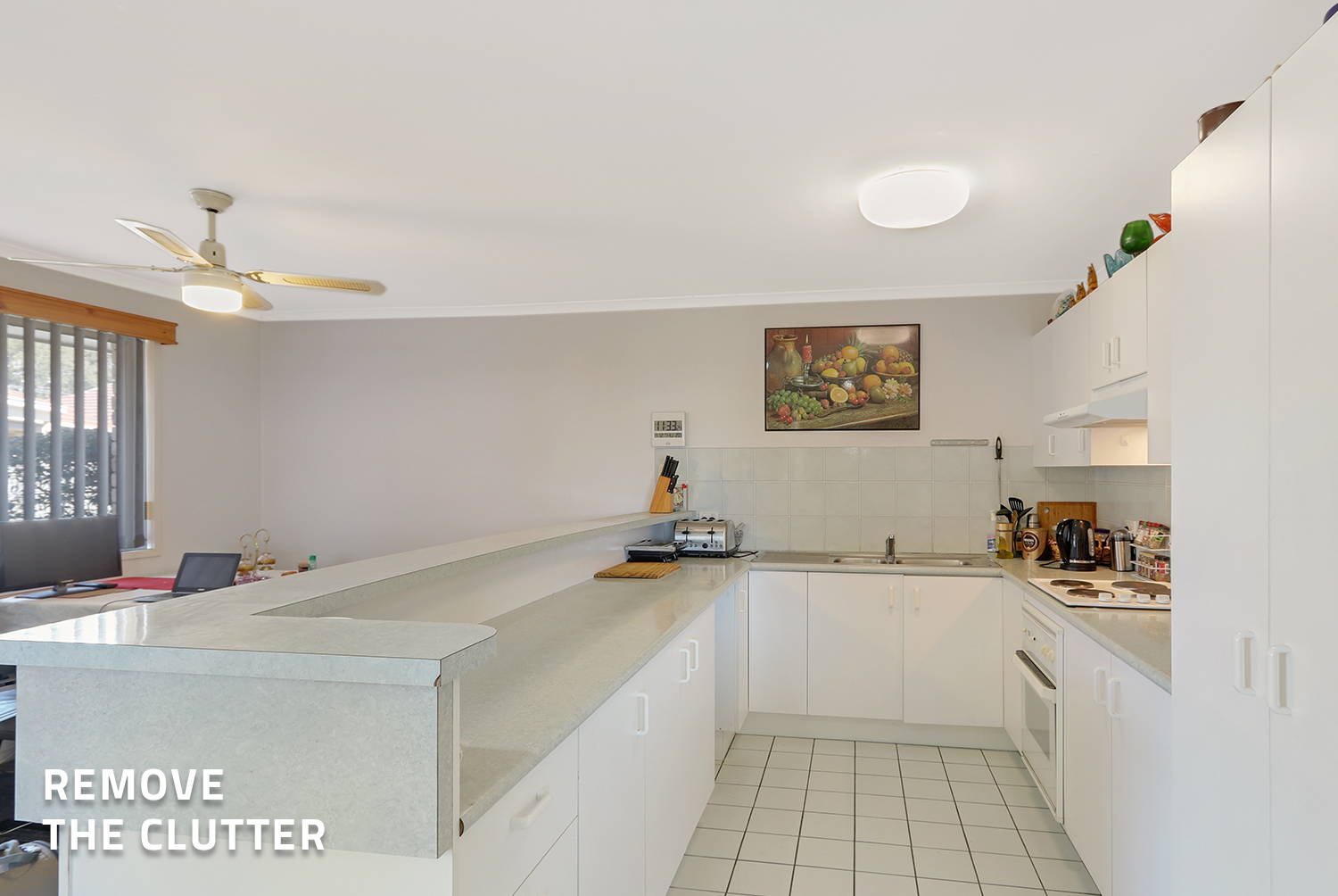 You can see in this image the photographer has tried to adjust the blinds however the angle is in the wrong direction which is less than ideal. We would also recommend removing the items on the benchtop to create a better shot. On the plus side, this is a great angle for highlighting the appliances and the abundance of storage on offer.