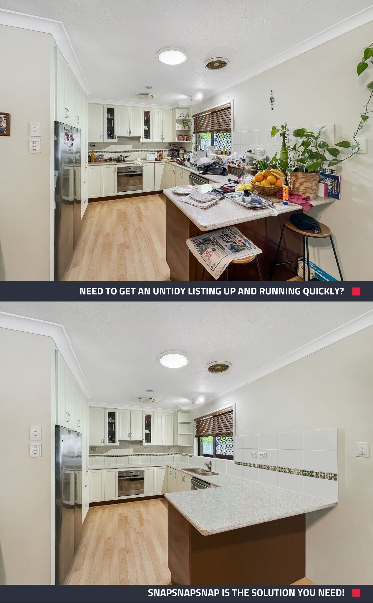 - Cluttered kitchen: Pots, pans, bowls, and spices can fill counters, making the space look cramped. Brad shows how to shoot the room as it is, then how to submit the images in SnapSnapSnap so our professional editors can digitally remove distractions and reveal spacious, inviting counters.