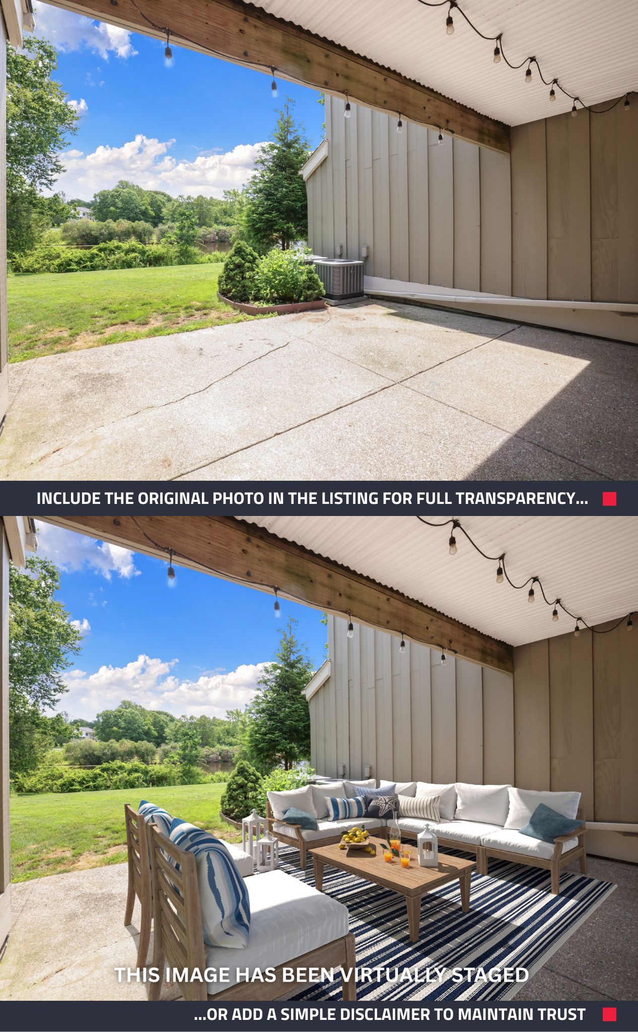- Be transparent about the home’s condition while using edited visuals – a great way is to include a disclaimer on edited images.
