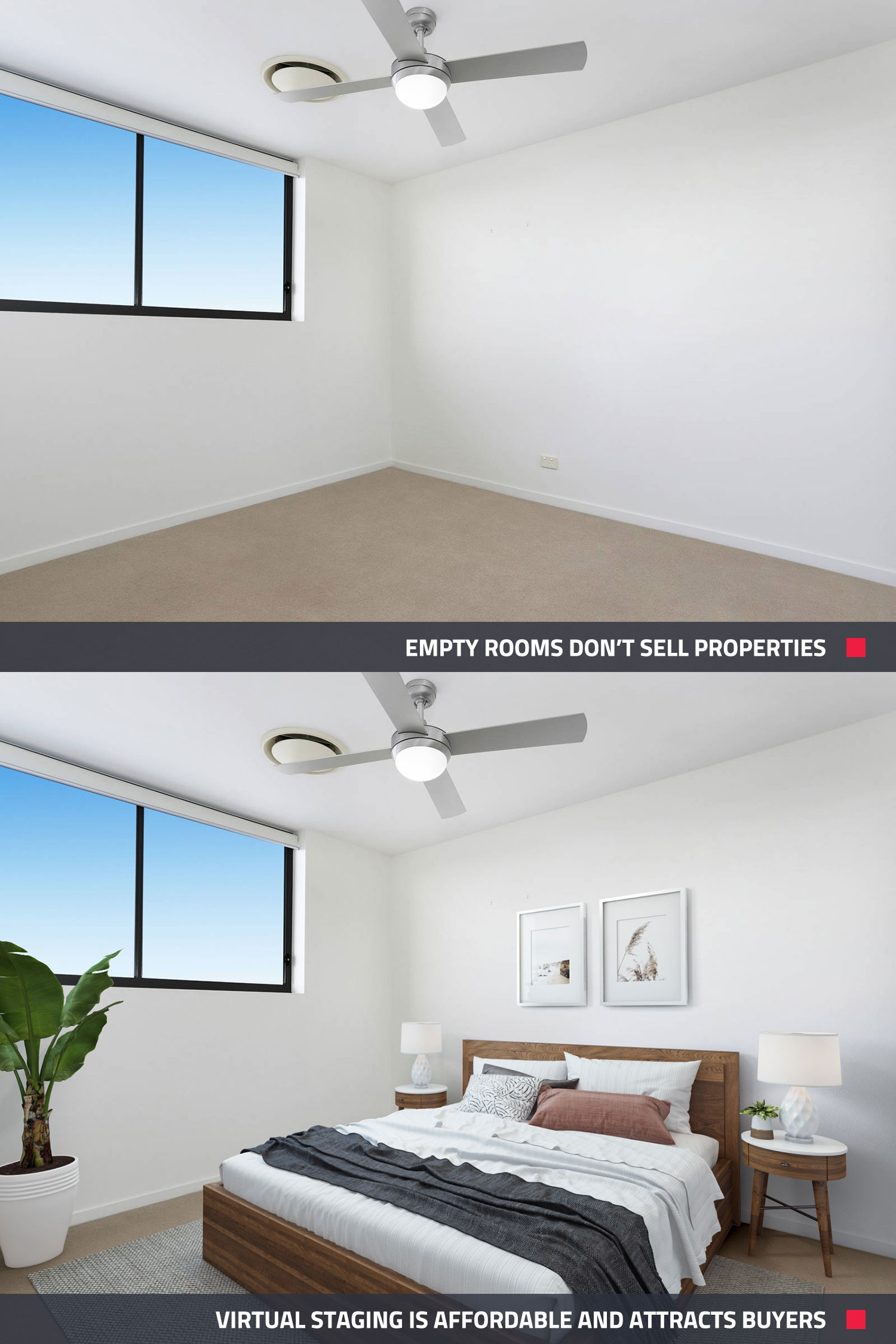 3. Saves a lot money. Currently, it costs approximately $1,000 a week in Australia to physically stage a property. A cost that can not only add up quickly but is also not an option for some people. Alternatively, the cost of a foam board to present your virtually staged images is as little as $38 per board, making this a fantastic option in many cases.